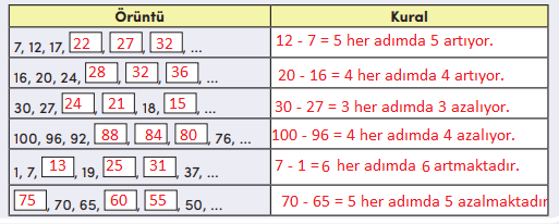 1. Aşağıdaki sayı örüntülerinde eksik olan terimleri ve örüntünün kuralını yazınız.