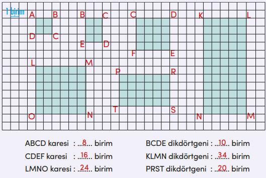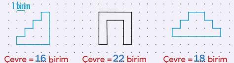 1. Aşağıdaki kareli kâğıtta verilen geometrik şekillerin çevre uzunluklarını birimkareleri sayarak bulunuz. Bulduğunuz sonuçları noktalı yerlere yazınız.