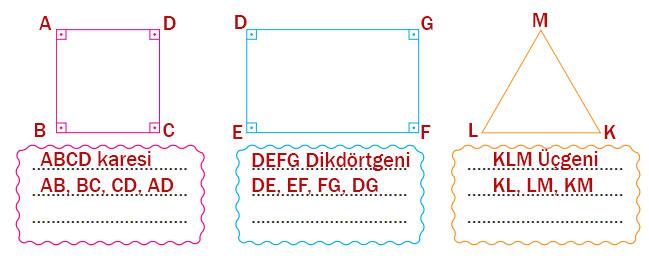 1-) Aşağıdaki geometrik şekilleri isimlendiriniz. Geometrik şekillerin isimlerini ve kenarlarını yazınız.