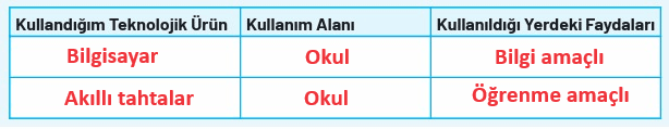 Defterinize aşağıdaki gibi bir tablo oluşturunuz. Evde, okulda ve sokakta kullandığınız teknolojik ürünleri ve kullanım alanlarını tabloya yazınız.