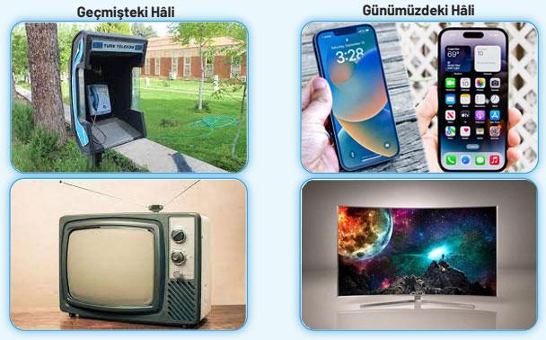 Aşağıdaki çerçevelerin içerisine seçeceğiniz iki teknolojik ürünün geçmişteki ve günümüzdeki görsellerini bulup yapıştırınız. Bu ürünlerin geçmişteki ve günümüzdeki kullanım şekillerini karşılaştırarak aralarındaki farkları kısaca yazınız.