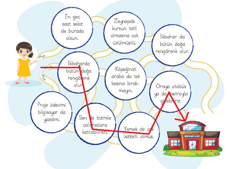 a. Hülyanın kütüphaneye gidebilmesi için “de” bağlacının ve “-de” ekinin doğru kullanıldığı cümleleri takip etmesi gerekiyor, Gidebileceği yolu çizerek onu kütüphaneye ulaştırınız.