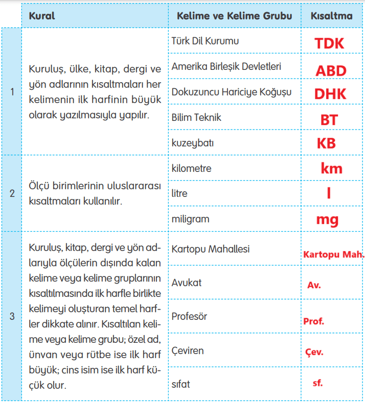 b. Aşağıdaki tabloda bazı kelimeler ve bu kelimelerin kısaltmaları verilmiştir. Tabloyu inceleyerek seçeceğiniz kısaltmalardan beş tanesini cümle içinde kullanınız.