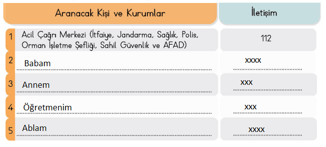 Metinde geçen “Kırmızı Alarm” kavramı acil durumları ifade etmek için kullanılır. Ciddi kırmızı alarm durumlarında “112 Acil Çağrı Merkezi” aranır. Siz de kırmızı alarm durumunda aramanız gereken aile üyelerinizi ve numaralarını tabloya örnekteki gibi yazınız.