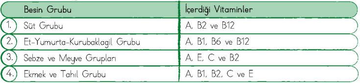 Cevap: Tabloya göre besin gruplarında en fazla bulunan vitamin A vitaminidir.