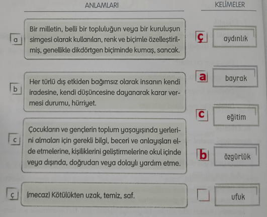 Yazılışları farklı, anlamları aynı olan kelimelere eş anlamlı kelimeler denir. “Kırmızı” ve “al”, yazılışları farklı olmasına rağmen anlamları aynı olan eş anlamlı iki kelimedir. Bu bilgiye göre aşağıda verilen kelimeleri örnekteki gibi eş anlamlılarıyla eşleştiriniz.