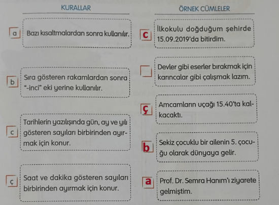 Yukarıda verilen bilgilerden faydalanarak aşağıdaki cümlelerde ( ) gösterilen yerlere uygun noktalama işaretlerini yazınız.