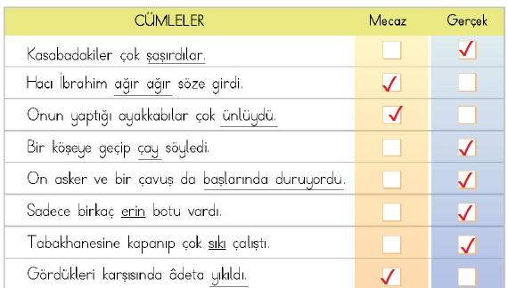 Verilen örnekleri inceleyiniz. Siz de cümlelerdeki altı çizili kelimelerin hangi anlamda kullanıldığını belirleyerek işaretleyiniz.