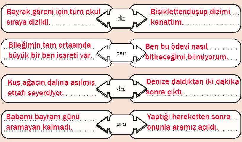 4.Verilen eş sesli kelimelerin farklı anlamları ile cümleler yazınız.