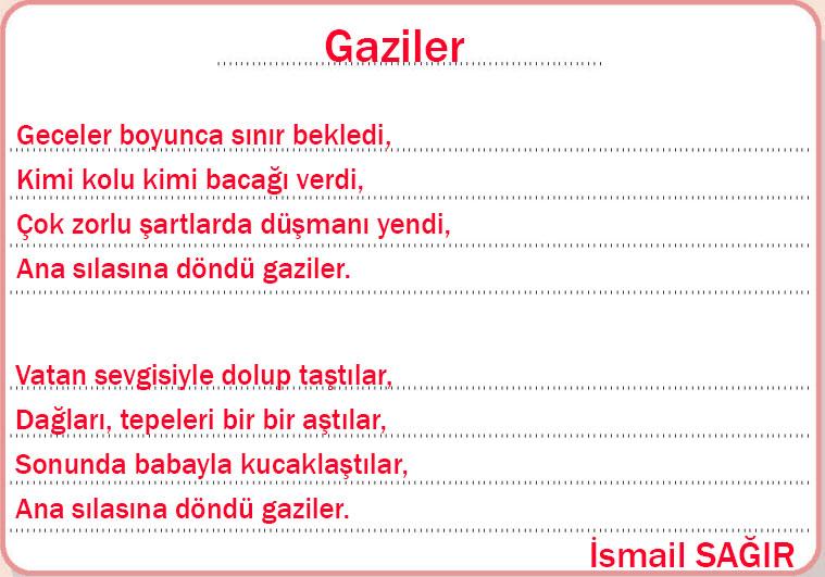 11. Ülkemizin bugünlere gelmesine büyük katkısı bulunan şehit ve gazilerimiz için bir şiir yazınız.