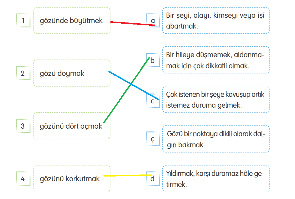 Metinde geçen deyimleri belirleyerek aşağıdaki yazma alanına yazınız. Bu deyimlerin anlamlarını geçtikleri cümleden hareketle tahmin ediniz. Tahminlerinizi sözlük anlamlarıyla karşılaştırınız.