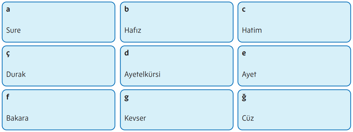 B. Aşağıdaki kutucuklarda Kur’an-ı Kerim’le ilgili bazı kavramlar verilmiştir. Soruları kutucuklardaki harfleri kullanarak cevaplayınız. Aynı kutucuğu birden fazla soru için kullanabilirsiniz.