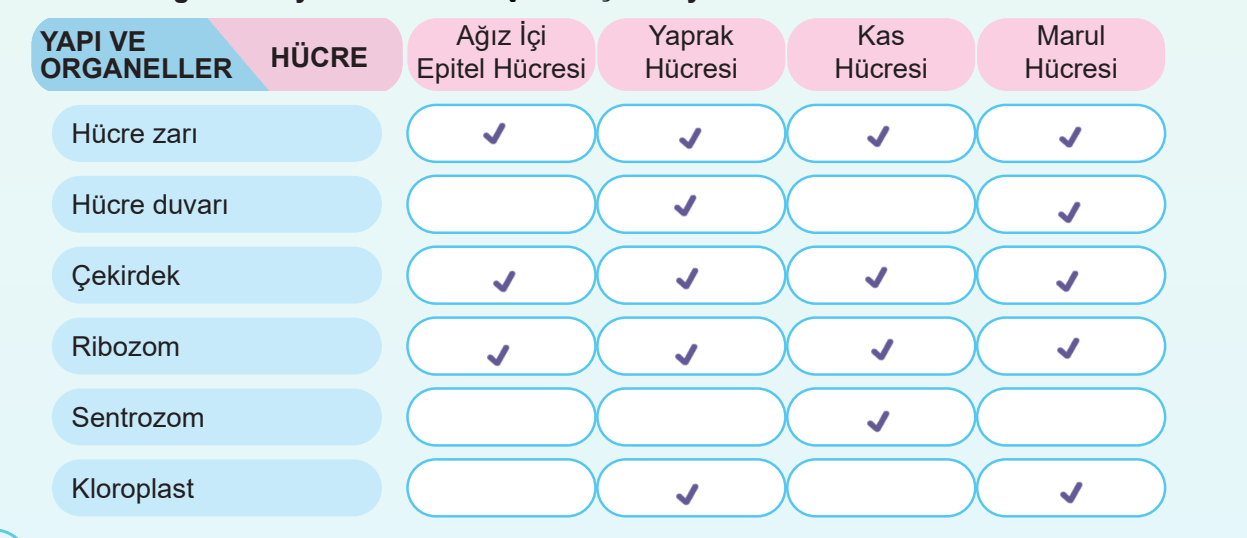 2. Aşağıdaki tabloda bazı hücreler ile yapı ve organeller verilmiştir. Bu yapı ve organellerden ilgili hücreye ait olanları “✔ ” ile işaretleyelim.