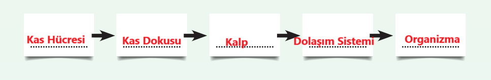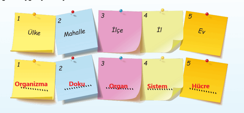 1. “Ülke, organizma gibi uyumlu bir bütündür. Ülkenin bütünlüğü organizmadaki hiyerarşik düzene benzetilebilir.” ifadesinden yola çıkarak ev, mahalle, ilçe, il kavramlarına karşılık gelecek şekilde organ, organizma, sistem, doku ve hücre kavramlarını aşağıdaki uygun yerlere yazınız.