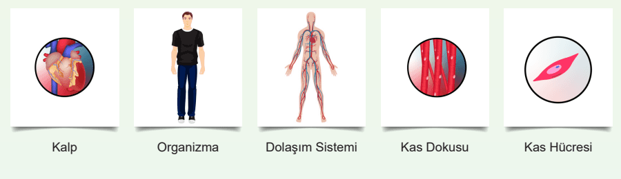 1. Bu kavramları en basit birimden başlayarak en karmaşık yapıya doğru aşağıdaki kutulara yazarak sıralayalım.