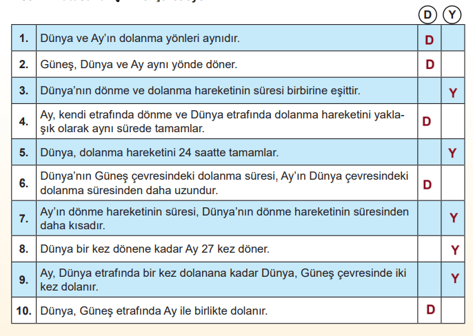Aşağıdaki ifadelerin doğruluk durumunu belirleyelim. İfade doğru ise “D”, yanlış ise “Y” kutusunu “ ✓” ile işaretleyelim.