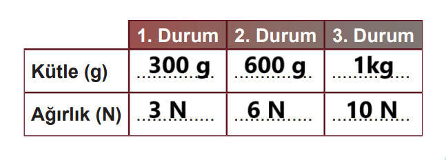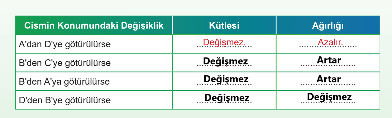 Buna göre cismin farklı konumlardaki kütle ve ağırlık durumunu belirleyelim ve tablodaki ilgili alanlara örnekteki gibi yazalım.
