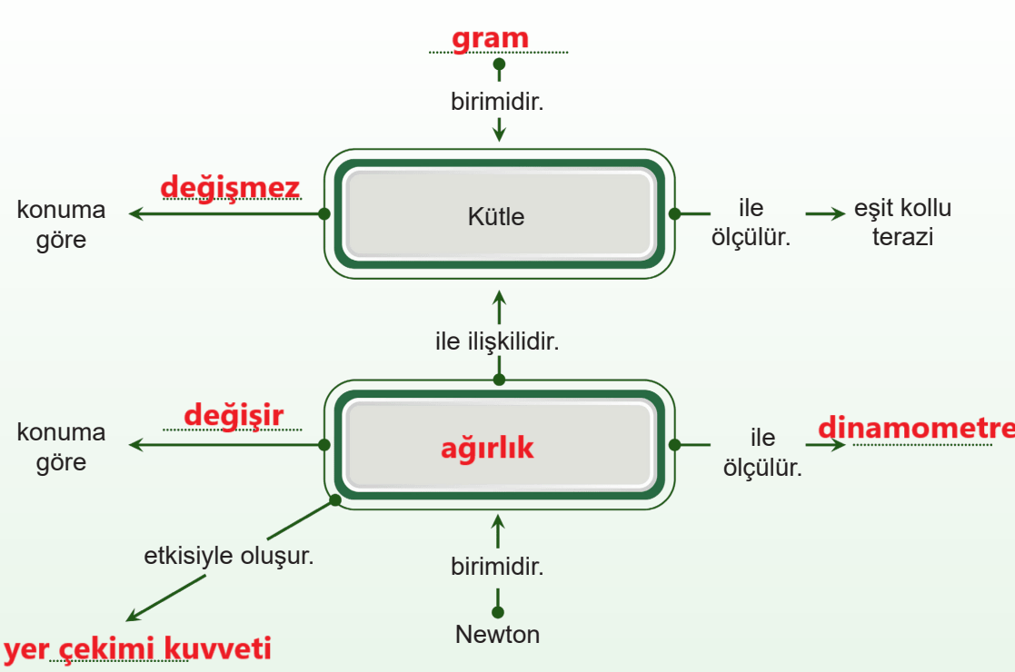 Kütle ve ağırlık ilişkisi konusuna yönelik hazırlanan aşağıdaki kavram haritasında bazı kısımlar boş bırakılmıştır. Kutu içindeki kelimelerden uygun olanları yazarak kavram haritasını tamamlayalım.