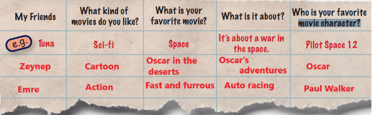 Çeviri: Sınıfta bir anket yapın. Arkadaşlarınıza en sevdikleri okul derslerini, saatlerini, günlerini ve materyallerini sorun. Cevaplarını tabloya not edin.