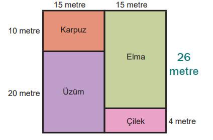 3) Fatih Bey, elma yetiştirdiği bölgenin alanını bulmak istemektedir. Bu bölgenin alanını veren farklı sayı cümleleri yazarak bu sayı cümleleri arasındaki ilişkiyi ifade ediniz.