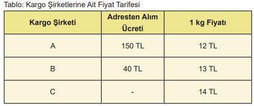 2-) Aşağıda üç farklı kargo şirketine ait fiyat tarifesi gösterilmiştir.