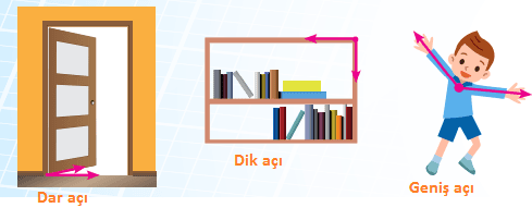 Daha önce açıların dar, dik ve geniş açı olarak sınıflandırıldığını görmüştünüz. Bunu yaparken de yüzeyi dikdörtgen şeklinde olan bir kitabın köşesini dik açı olarak referans almıştınız. Şimdi de etrafınızdaki açıları yüzeyi dikdörtgen şeklinde olan bir kitaplığın, kapının ve masanın köşesini örnek alarak dar, dik ve geniş açı olarak sınıflandırınız.
