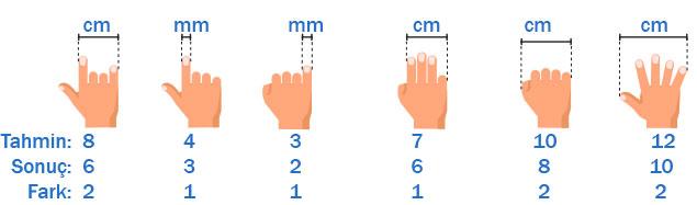 2) Aşağıdaki elin farklı duruşlarını inceleyiniz. Kendi elinizi düşünerek gösterilen uzunlukları tahmin etmeye çalışınız. Bu uzunlukları hangi uzunluk ölçü birimi ile tahmin etmek daha uygun olur? Tahminlerinizi arkadaşlarınızın tahminleriyle karşılaştırınız. Cetvel yardımıyla elinizin aşağıdaki elin duruşlarına göre gerçek ölçümlerini yapınız. Tahminî sonuç ile gerçek sonucu karşılaştırınız.