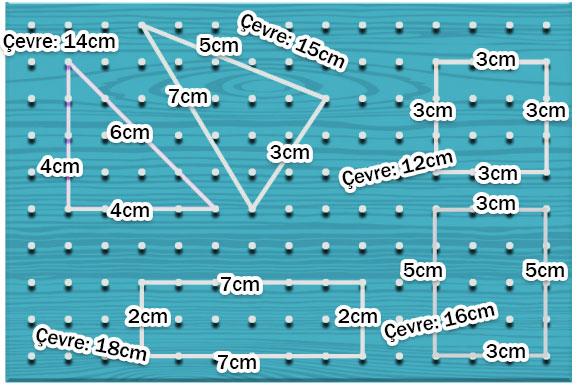 1) Aşağıdaki geometri tahtasında verilen geometrik şekillerin çevre uzunluklarını cetvelle ölçünüz. Bu şekillerin kenar ve çevre uzunluklarını santimetre cinsinden bularak yazınız.