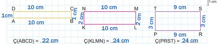 Aşağıdaki dikdörtgenlerin kenar uzunluklarını belirleyiniz. Daha sonra çevre uzunluklarını bularak altlarındaki noktalı yerlere yazınız.
