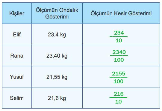 Ondalık gösterimlerin kesirlerin farklı gösterimi olduğunu öğrendiniz. O hâlde her bir ölçme sonucunun kesir gösterimini tabloya yazıp sembol kullanarak büyükten küçüğe doğru sıralayınız.