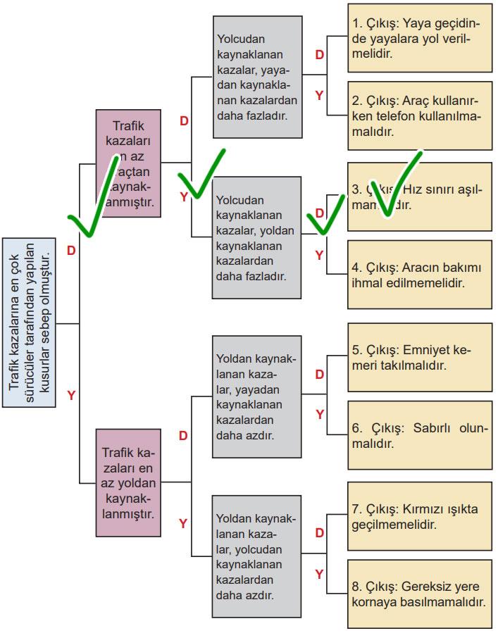 2023 yılında trafik kazalarına neden olan kusurların %88,9’unun sürücü, %9,0’ının yaya, %1,1’inin taşıt, %0,6’sının yolcu, %0,3’ünün yol kaynaklı olduğu tespit edilmiştir. Bu verilere göre aşağıdaki tanılayıcı dallanmış ağaçta doğru olan ifadeleri takip ediniz. Kaçıncı çıkışa geldiniz? Geldiğiniz çıkışı arkadaşlarınızla karşılaştırınız.