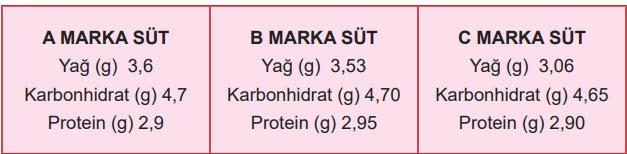 6) Üç farklı markaya ait sütlerin 100 gramının içerdiği yağ, karbonhidrat, protein miktarları aşağıda verilmiştir.