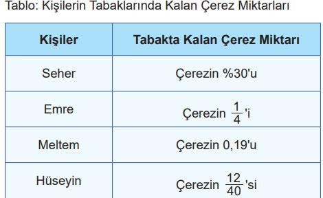 5) Seher; arkadaşları Emre, Meltem ve Hüseyin’i evine davet etmiştir. Seher’in annesi herkesin tabağına eşit miktarda çerez koymuştur. Çerezlerini yedikten sonra tabaklarında kalan çerez miktarlarına ilişkin bilgiler aşağıdaki tabloda verilmiştir