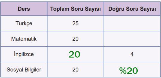 6) Cansu; Türkçe, matematik, İngilizce ve sosyal bilgiler dersi sınavında tüm soruları çözmüştür. Bu sınavlarda çözdüğü ve doğru cevapladığı soru sayılarından bazıları aşağıda verilmiştir.