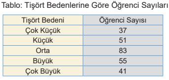 Atatürk Ortaokulu öğrencileri, 29 Ekim Cumhuriyet Bayramı töreni için yandaki baskılı tişörtlerden almışlardır. Alınan tişörtlerin bedenleri; Çok Küçük, Küçük, Orta, Büyük ve Çok Büyük’tür. Her bir bedenden kaçar tane tişört alındığını gösteren sıklık tablosu aşağıda verilmiştir. Bu tablodaki verileri nokta grafiği ile görsel olarak özetlemek kullanışlı mıdır? Veri sayısının fazla olduğu araştırmalarda görsel özetleyici olarak nokta grafiği kullanmanın zorlukları olabilir mi? Tartışınız