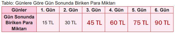 Ertuğrul ve kardeşi Hilal, istedikleri bisikleti alabilmek için bir kumbaraya her gün 15 TL atarak para biriktirmeye karar vermişlerdir. Ertuğrul, hangi gün toplam ne kadar paraları olacağını merak etmiş ve günlere göre toplam ne kadar para birikeceğini tabloda göstermiştir.