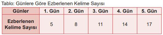 5) Ayşe, İngilizce öğrenmek için her gün düzenli sayıda kelime ezberlemeye başlamıştır. Ayşe’nin günlere göre ezberlediği toplam kelime sayısı aşağıdaki tabloda verilmiştir.