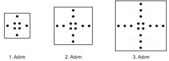 Aşağıdaki şekil örüntüsünde; 1. adım 3, 2. adım 7 ve 3. adım 11 çubukla oluşturulmuştur.