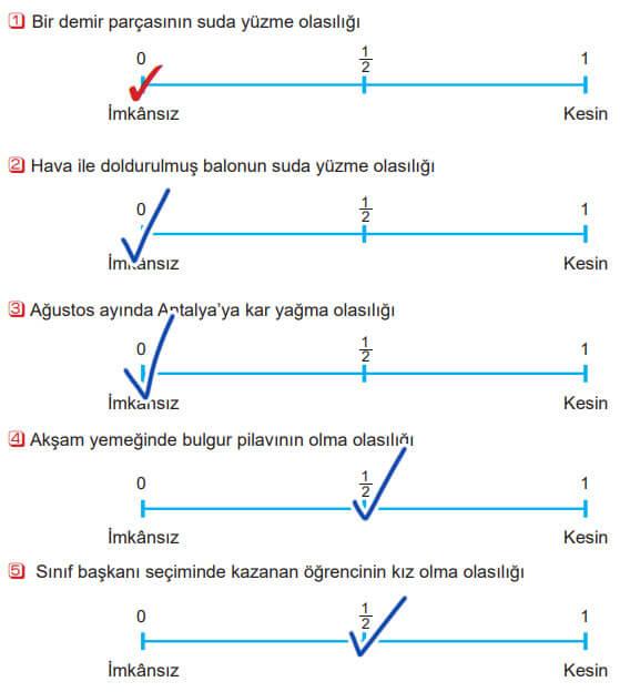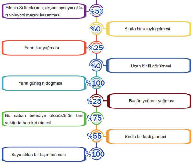 Aşağıdaki cümlelerde dile getirilen olayların olasılıklarına ilişkin tahminlerinizi % sembolü ile ifade ediniz. Gerekçelerinizi sınıf arkadaşlarınızla paylaşınız. Kesin ve imkansız olayların yüzde değerlerinin hangi doğal sayılara karşılık geldiğini ve diğer olayların olasılık değerlerinin 0 ile 1 arasında olup olmadığını arkadaşlarınızla tartışınız.