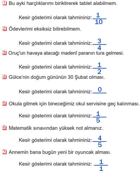 Aşağıdaki olayların olma olasılıklarını tahmin edip kesir gösterimi ile yazınız.