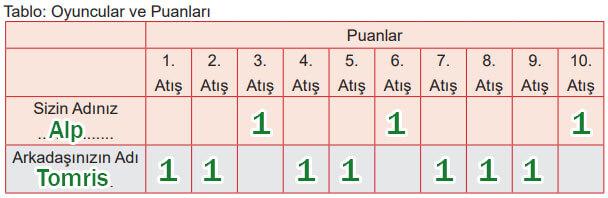 Oyunu bir arkadaşınızla oynayınız ve aşağıdaki tabloya puanlarınızı kaydediniz.