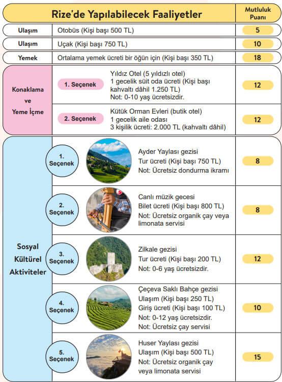5. Aşağıdaki tabloda lise öğrencisi Begüm’ün anne ve babası ile tatil için gidecekleri Rize’de yapabilecekleri faaliyetler, faaliyetlerin ücret bilgisi ve mutluluk puanlarına yer verilmiştir