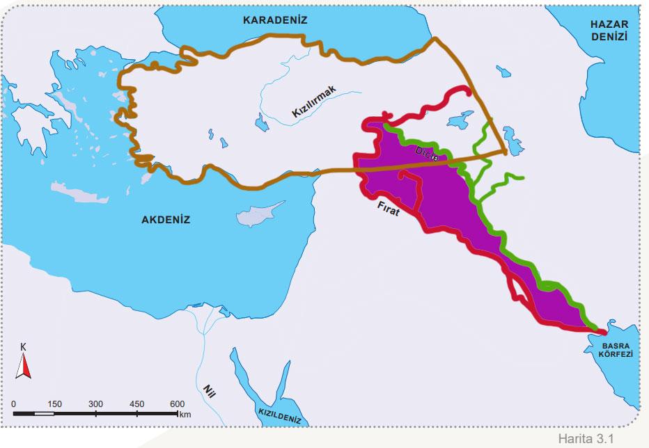 1. Adım: Harita üzerinde Fırat ve Dicle nehirlerini daha belirgin hâle getiriniz. İki nehir arasında kalan alanı boyayınız.
