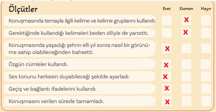 a. Yaşadığınız şehrin elli yıl sonra nasıl bir görünüme sahip olabileceğini düşününüz. Ardından tahminlerinize ilişkin 2-3 dakikalık bir konuşma tasarlayınız. Konuşmanızı arkadaşlarınıza sununuz. Konuşmanızı yaparken aşağıdaki ölçütleri dikkate alınız.