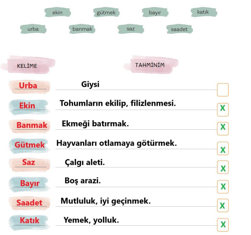 Okuduğunuz şiirde geçen aşağıdaki kelimelerin anlamını tahmin ederek yazınız. Tahmininizin doğruluğunu TDK Güncel Türkçe Sözlük’ten kontrol ediniz. Doğru çıkan tahminlerinizin karşısındaki kutuyu işaretleyiniz.