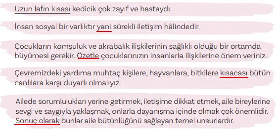 e. Altını çizdiğiniz özetleme işlevi gören ifadelerinden iki tanesini seçerek birer cümlede kullanarak defterinize yazınız.