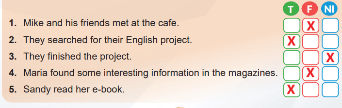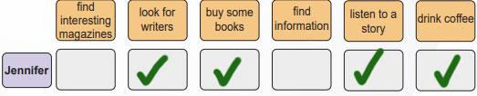 Mandy: Amy bazı önemli kitapları okudu, o gerçek bir kitap kurdu. Mert İspanyolca dersi için sözlükten bazı kelimelere baktı. Joe vahşi hayvanlar hakkında bazı bilgiler buldu. Hande kız kardeşine birkaç roman ödünç aldı. Liz bazı dergileri okuyor, modaya meraklı olduğunu biliyorsun. Ve Luis sadece tarih sınavına çalışıyordu.