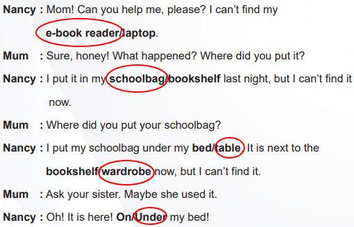 Hello, I’m Lisa. I am a student. I was busy last week, so I didn’t have any time to tidy up. My books and magazines are on the floor. My e-book reader is on my bed. My schoolbag is under the bed. The dictionary is under my desk. I borrowed it from the library. I looked for my novel, but I didn’t find it yesterday. Oh! It is here in my bag.