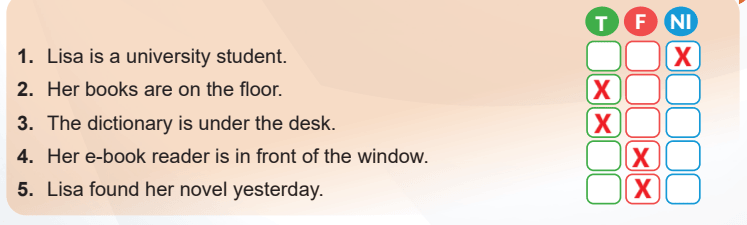 Merhaba, ben Lisa. Ben bir öğrenciyim. Geçen hafta meşguldüm, bu yüzden toparlanmaya zamanım olmadı. Kitaplarım ve dergilerim yerde. E-kitap okuyucum yatağımın üstünde. Okul çantam yatağın altında. Sözlük masamın altında. Kütüphaneden ödünç aldım. Romanımı aradım ama dün bulamadım. Ah! Burada, çantamda.