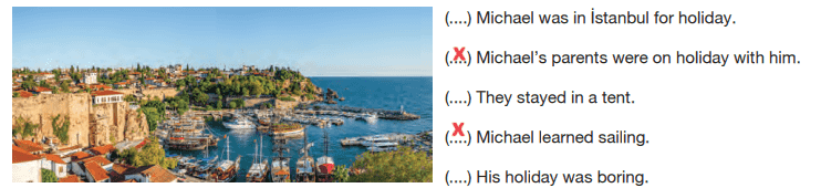 Cevap: Michael was in Antalya for vacation. Michael visited the beach and historical sites. While on the beach, he sailed and sunbathed. He took photographs of historical places. (Michael tatil için Antalya’daydı. Michael plajı ve tarihi yerleri ziyaret etti. Sahildeyken yelken açtı ve güneşlendi. Tarihi mekanların fotoğraflarını çekti.)